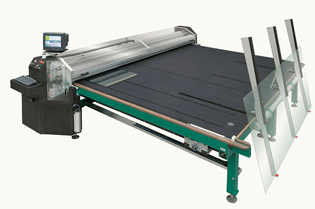 Mesa de corte automática para vidros float da linha Base Cut, da Lisec. Compacta, assegura máxima precisão, mínimas tolerâncias de corte e alta durabilidade