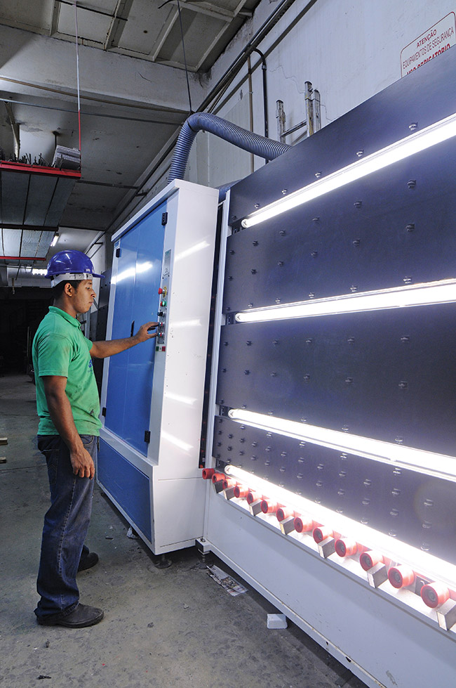 Na Conlumi, a manutenção preventiva é feita semanalmente. Menor tempo de hora parada traduz-se em hora produtiva e maior volume produzido. Na foto, lavadora de vidro