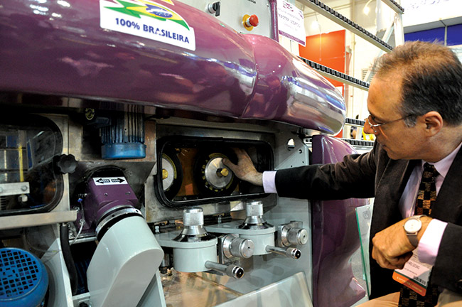 Daniel Leicand, diretor a da Abrasipa, demonstra aplicação do rebolo da empresa em máquina da Use-mak