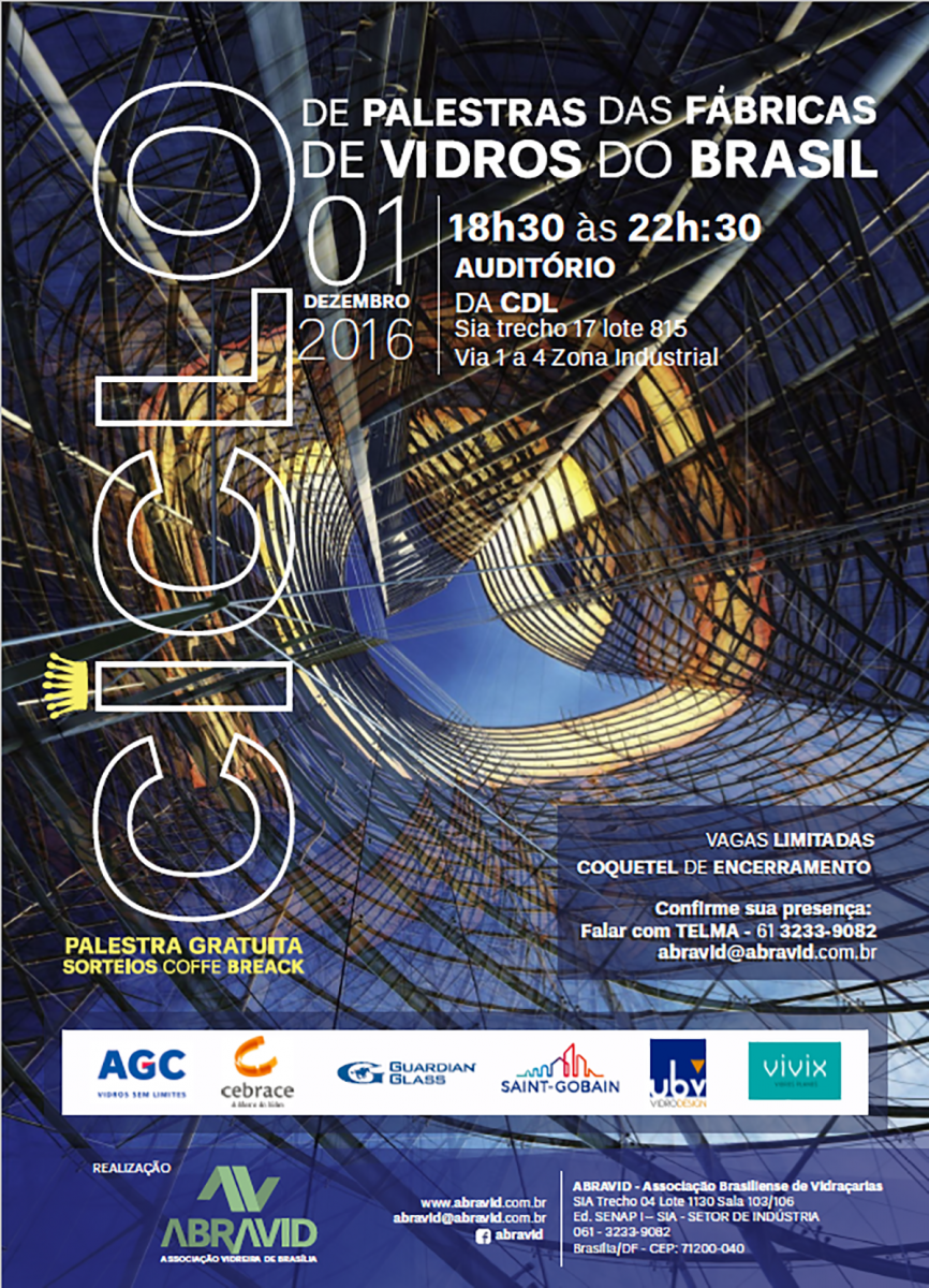 A ABRAVID, Associação Vidreira de Brasília, realiza no dia 1° de dezembro o Ciclo de Palestras das Fábricas de Vidro do Brasil. O evento apresenta palestras técnicas das indústrias de base brasileiras AGC, Cebrace, Guardian, Saint-Gobain Glass, UBV e Vivix.