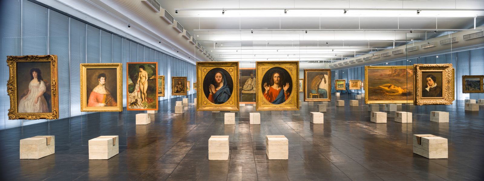 As obras foram retiradas das paredes e posicionadas próximas ao público, trazendo uma sensação de aproximação e maior interação com os visitantes. Os cavaletes foram feitos de vidros Planibel Clear 10mm, o que os torna extremamente claros, proporcionando uma sensação de invisibilidade, como se os quadros estivessem flutuando no ambiente. Os vidros foram fabricados no Brasil pela AGC e processados pela Cyberglass.