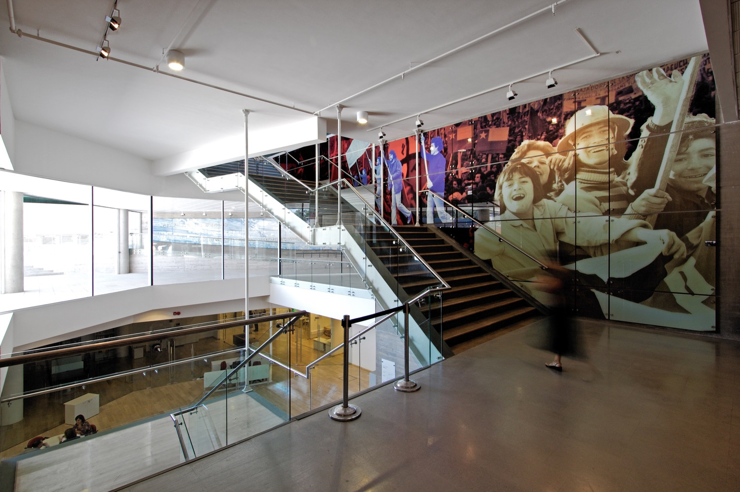 Diferentemente da maioria dos museus, que consistem em uma sucessão de salas separadas, o edifício do Museu da Memória é constituído por um grande espaço em três níveis, sem paredes transversais, integrado de modo que o visitante não perca a noção do conjunto. “Os paramentos que dividem os ambientes são todos de cristal serigrafado com fotografias que ilustram a dor, a angústia e a opressão a que o povo chileno foi submetido”, explica o arquiteto Lucas Fehr, co-autor do projeto. “Ao mesmo tempo, o cristal garante a luminosidade dos espaços e de alguma forma reduz a tensão causada pela exibição de episódios traumáticos da história do Chile”.