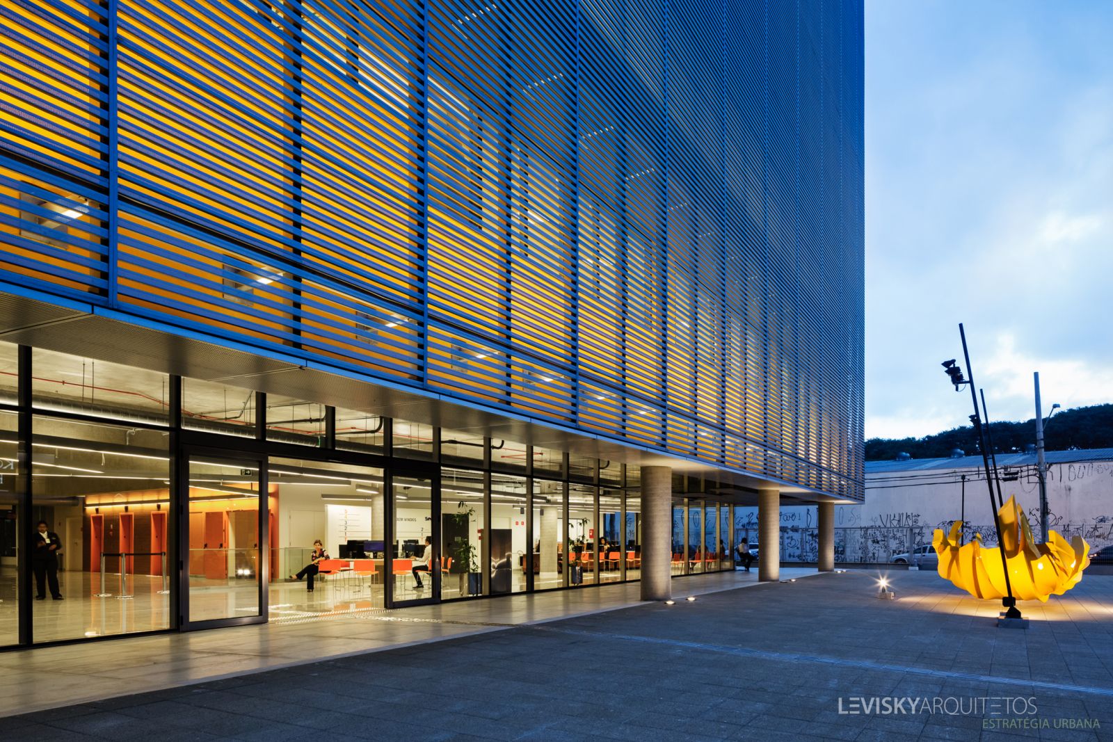 O projeto de arquitetura da Unidade Senac São Miguel Paulista traz soluções que valorizam convivência e integração através da aplicação de grandes panos de vidro. A fachada frontal é composta de esquadrias com montantes de alumínio, preenchidos com lã de rocha e vidros laminados 13 mm, com PVB acústico (6 mm low-e na face 2 + PVB acústico S-Lecsaf + 6 mm). O bloco principal conta, ainda, com sistema de fachada ventilada composta por um grande mosaico com placas de agregado cimentício e de material reciclado, com janelas de vidro duplo (4+6 mm low-e na face 2 + 20 mm fr câmara de ar + 4+4 mm vidro float) e micro persianas (38mm) embutidas na caixilharia.