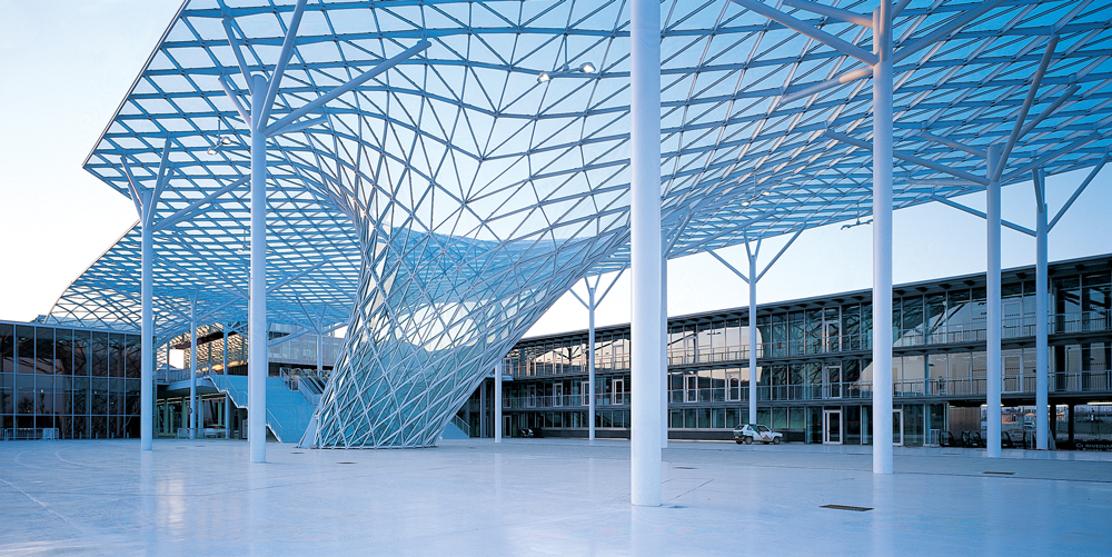 Com mais de 40 mil m² de superfície envidraçada, o Milan Trade Fair, em Milão, é um dos mais exuberantes centros de exposição da Europa. A cobertura ondulada de vidro e aço cobre oito pavilhões, em uma área que soma 345 mil, e chega a mais de 30 m de altura em determinados pontos. Ao longo de toda a sua extensão, as mais de 100 mil placas que compõem a onda de vidro assumem formato quadrado nas partes planas e triangular nas partes curvas, para garantir o movimento fluido.