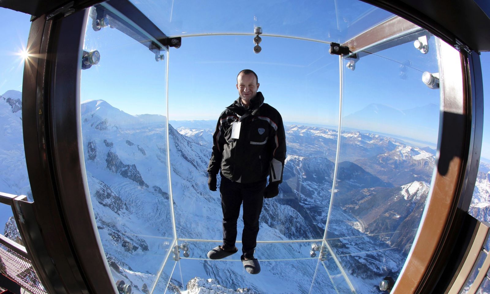 Instalada no ponto mais alto da montanha de Aiguille du Midi, em Chamonix, nos Alpes Franceses, em uma altitude de 3842 metros, a cabine de vidro batizada de “Step into the Void” (passo em direção ao vazio) é fechada por vidros temperados e laminados em suas cinco faces-piso, teto e três lados. A estrutura projeta-se para fora do terraço e, através do chão, os turistas enxergam a paisagem há mais de mil metros de altura, vivenciando uma experiência única.