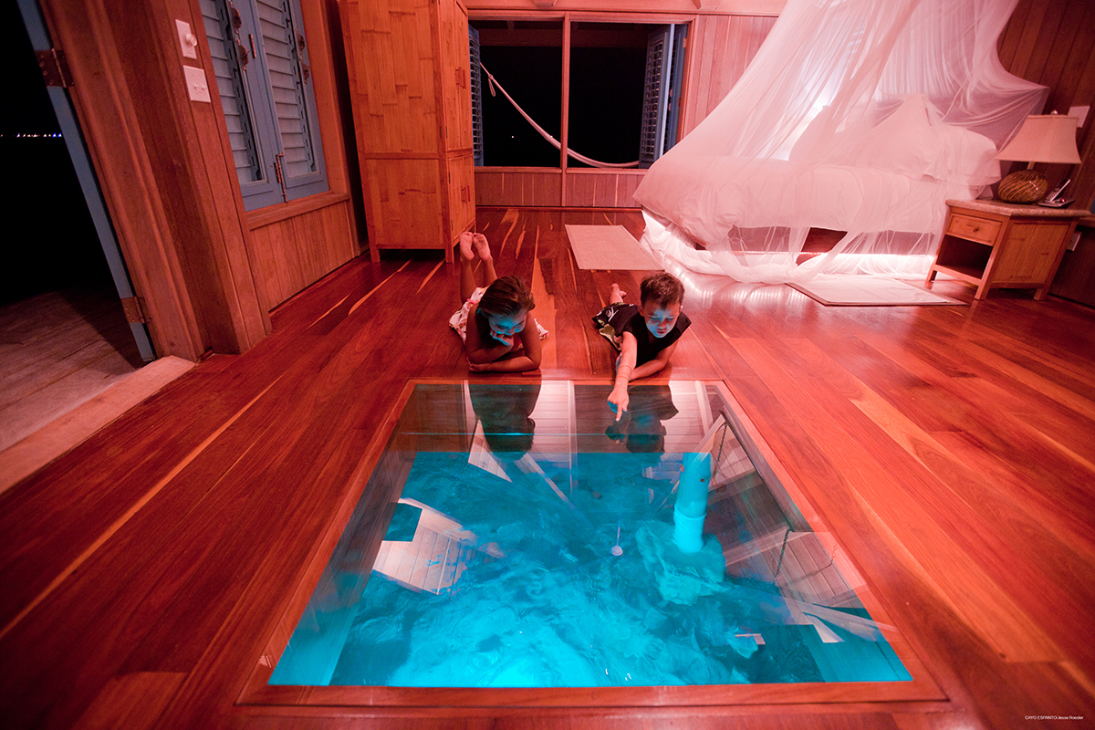 O resort Cayo Espanto, localizado em Belize, uma ilha do Caribe, chama a atenção por um de seus bangalôs, que tem um piso de vidro sobre a água, por onde os hóspedes do quarto podem contemplar a vida marinha