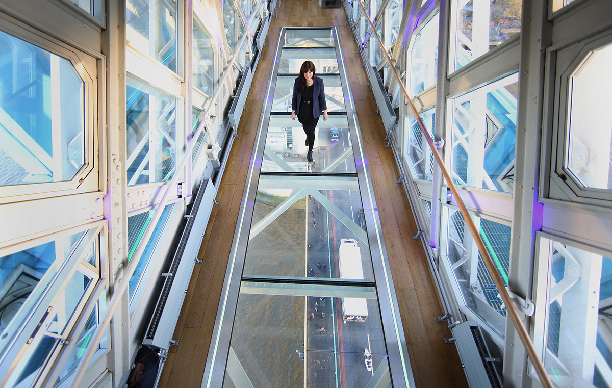 Da Tower Brigde, a 42 metros acima do rio Tamisa, em Londres, na Inglaterra, os visitantes tem uma visão panorâmica e podem visualizar a movimentação de carros, ônibus e pedestres sob os pés. O piso de vidro mede 11 metros de comprimento e 1,8 metros de largura e compreende painéis pesando 530 quilos