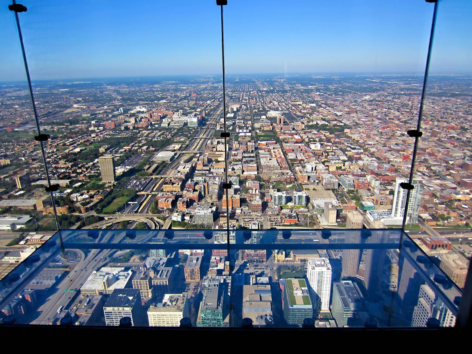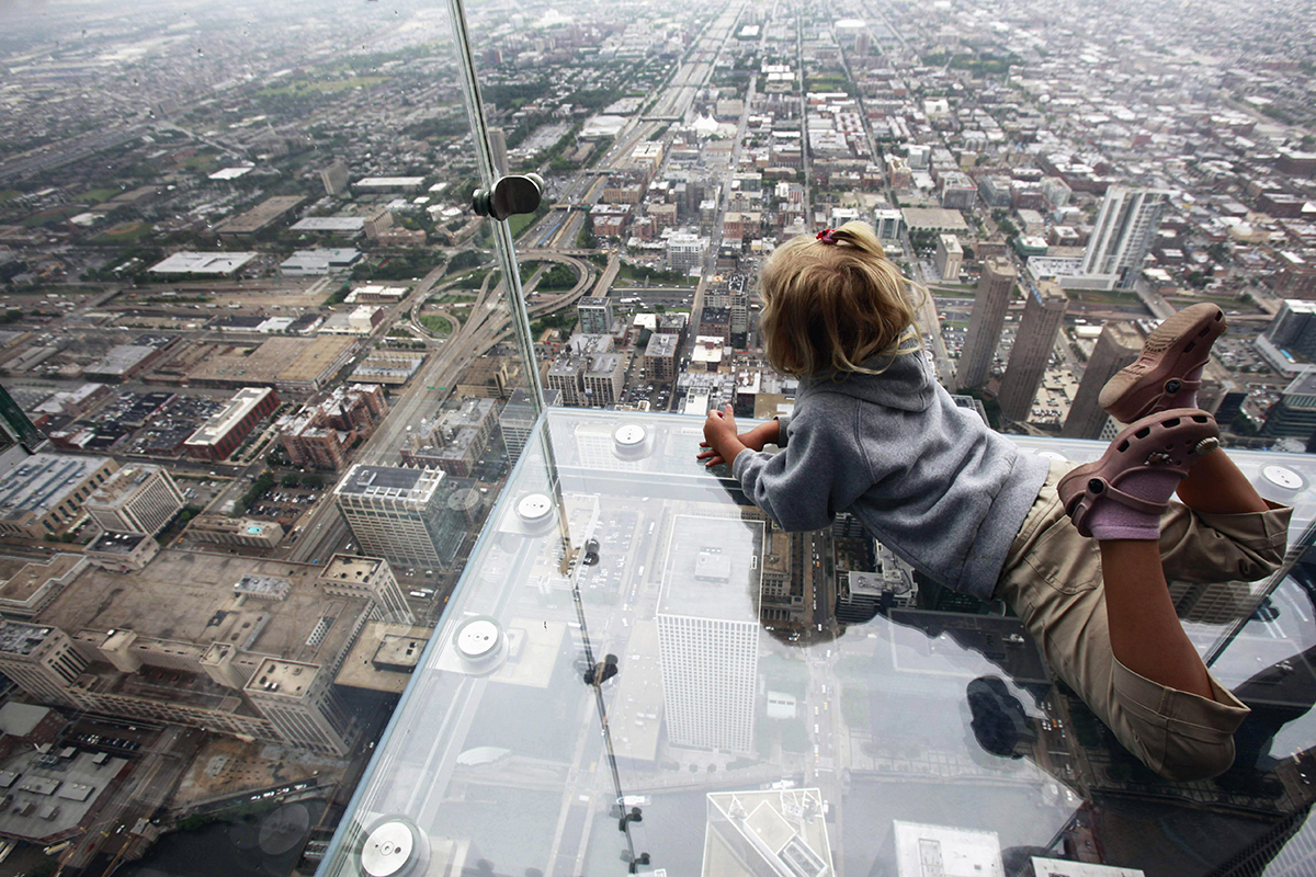 A plataforma suspensa de vidro Skydeck Chicago está localizada no arranha-céu de 108 andares Willis Tower em Chicago, nos Estados Unidos. Os visitantes sem medo de altura podem apreciar a vista da cidade a mais 400 metros de altura do chão. A estrutura foi feita com chapas de vidro intercaladas com SentryGlass