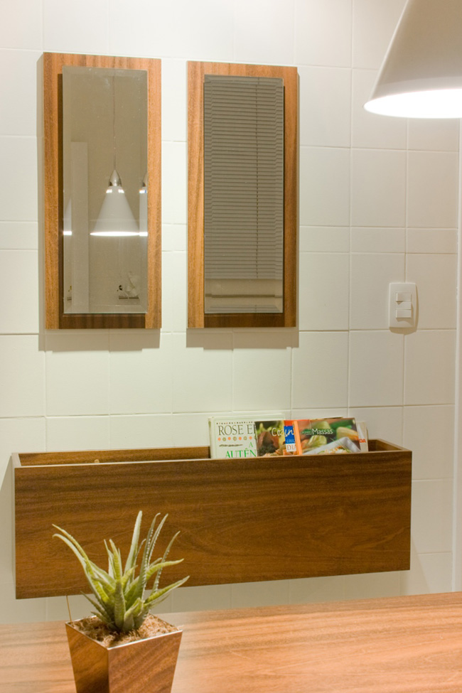 Misturados com elementos da marcenaria, os espelhos funcionam como alternativa para valorizar espaços escondidos. O cantinho dos livros de receita e revistas ganhou dois espelhos para equilibrar o espaço da cozinha.