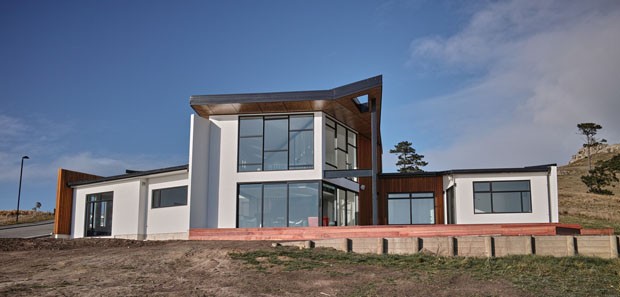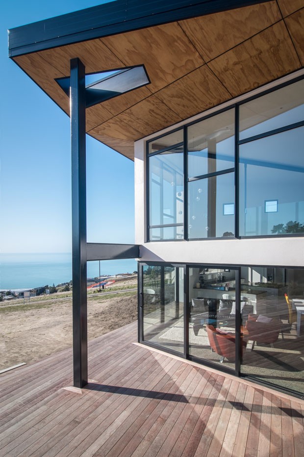 À primeira vista, a fachada é marcada por vidro suas aberturas de diversos tamanhos, a exemplo da imensa porta de entrada e de esquadrias estreitas e compridas. O desenho irregular do telhado, que vai além dos limites da casa e forma um belo beiral em alguns pontos.