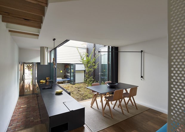 Com projeto elaborado pelo escritório Austin Maynard Architects, essa casa antiga em Melbourne, Austrália, ganhou contornos contemporâneos, muita iluminação e se adequou à nova família. O casal e seus dois filhos queriam ambientes fluidos e espaço suficiente para manter o lar organizado. Para isso, os arquitetos planejaram um novo patamar acima do existente e reformularam a construção original.