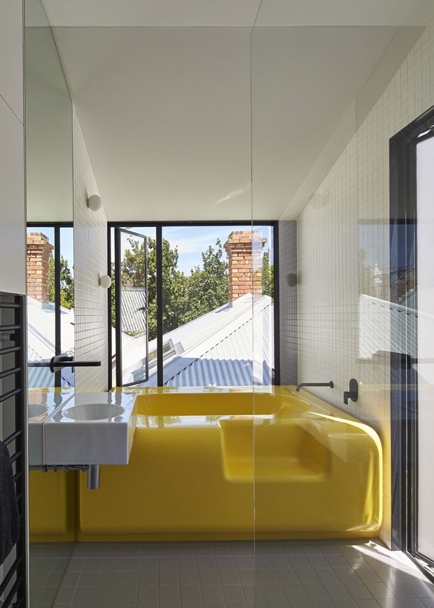 Com uma pequena área, o banheiro precisava ser eficiente e prático. Pensando nisso, os arquitetos abriram uma grande janela que permite a entrada de luz solar, reduzindo a proliferação de mofo. Além disso, desenharam uma banheira de fibra de vidro amarela, sem reentrâncias para evitar o acúmulo de sujeira. Nas paredes, instalaram uma espécie de calha que conduz a água até os drenos, posicionados no chão.