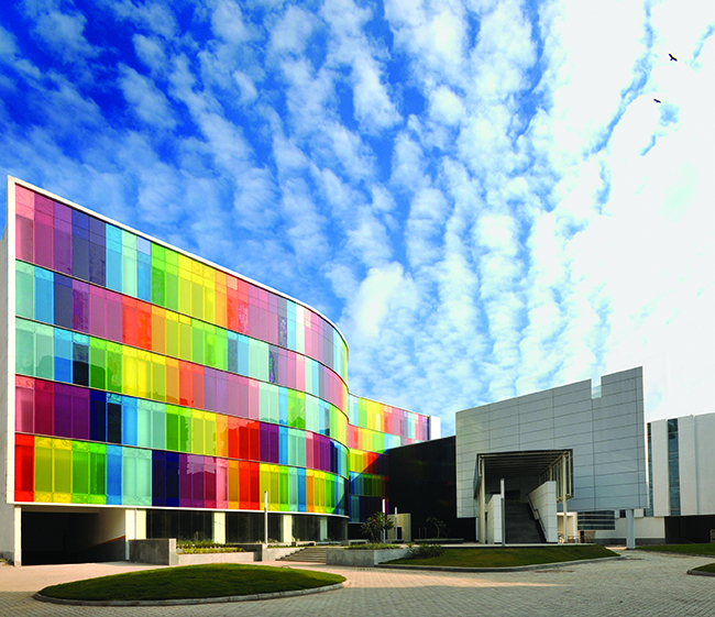 Laminados com películas de PVB da linha Vanceva, fabricadas pela Saflex, os vidros foram posicionados de forma quase aleatória, sem seguir qualquer padrão de repetição. Segundo Ajmera, essa característica traduz a natureza imprevisível do céu, além de representar o comportamento vibrante da juventude, que forma a maior parte do público frequentador do instituto. O briefing do cliente, lembra o arquiteto, solicitava uma escola de negócios que seguisse padrões internacionais, com instalações de última geração e espaços inteligentes para abrigar as salas de aula. “A linguagem arquitetônica que se manifesta no formato, nos materiais e nas cores do edifício é uma representação desse conceito”, ressalta. “As variações cromáticas da fachada conferem uma identidade única ao projeto, o primeiro desse tipo a ser erguido na Índia.”