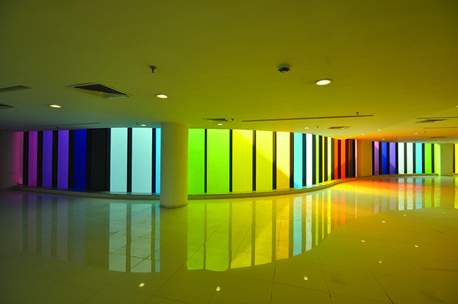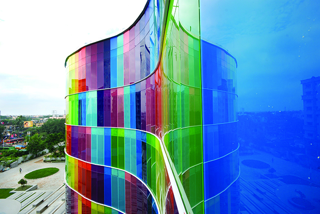 Fornecidas pela Thai-German Specialtt Glass, da Tailândia, as chapas retangulares da fachada colorida são compostas por duas camadas de vidros transparentes de 5 mm, cada uma com uma camada intercalar de PVB de 1.2 mm de espessura. “Além dos benefícios estéticos e de segurança, essas interlayers atuam também como isolante térmico”, frisa o arquiteto. “Assim, os vidros coloridos não somente foram a resposta ideal para o objetivo de produzir um efeito visual tanto no interior como no exterior do edifício, como também para reduzir a transmissão de calor nos espaços internos, garantindo isolamento e ao mesmo tempo a iluminação natural difusa desejada.”