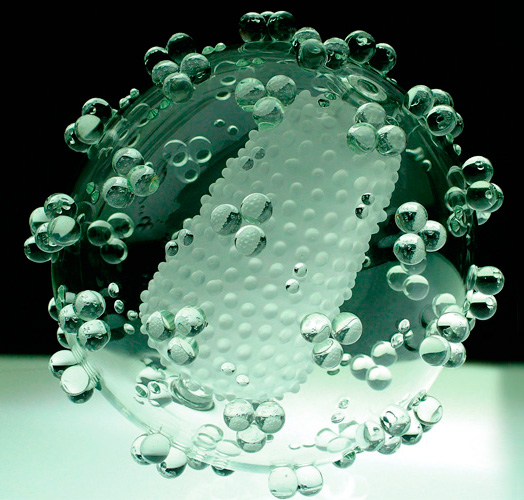 De fato, cada detalhe desses sofisticados e microscópicos assassinos, de suas cápsulas e núcleos, está retratado nas obras de Jerram. Brilhantes, seus destrutivos DNAs e RNAs assumem a forma de pontos espiralados esculpidos no vidro leitoso. E não seria um tanto inconveniente jogar tamanha luz sobre a beleza estética de seres tão nocivos? Jerram sustenta que não: “Hoje é comum entre jovens artistas britânicos a tendência de contemplar esteticamente a morte”, observa. Mas sua proposta vai além. “Sobretudo, acredito que meu trabalho tenha uma missão educativa.