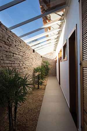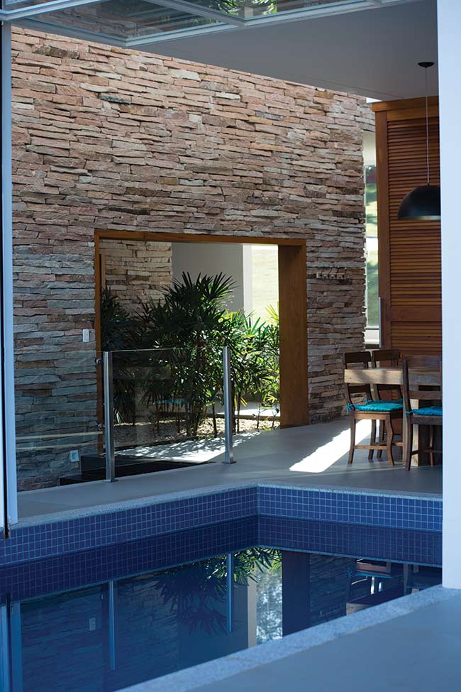 “Para especificar as aplicações do material, a incidência solar foi o principal fator considerado”, aponta Brant. Setorizada em três alas – área social, quartos e setor de hospedes – a residência estabelece uma distribuição dinâmica dos espaços, sempre marcados pela integração entre os diferentes usos: sala de estar, terraço, piscina, sala de jogos etc. “A entrada de luz natural para os ambientes contíguos a eles, além da integração visual que amplia os espaços, está entre as principais contribuições do vidro nas áreas de lazer”.
