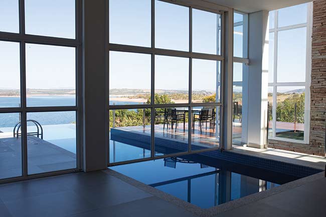 Em quase todas as aplicações, o vidro escolhido foi o incolor temperado de 8 mm, sem qualquer tratamento para aumentar ou reduzir transparência ou transmissão luminosa. “Os únicos que fugiram desse padrão foram os jateados, nas janelas dos banheiros”, diz Isabel. No visor da piscina, acrescenta, foi necessário empregar duas chapas de laminados com espessura de 10 mm cada, para suportar a pressão da água sem trincar. O material foi fornecido pela CR Vidros.