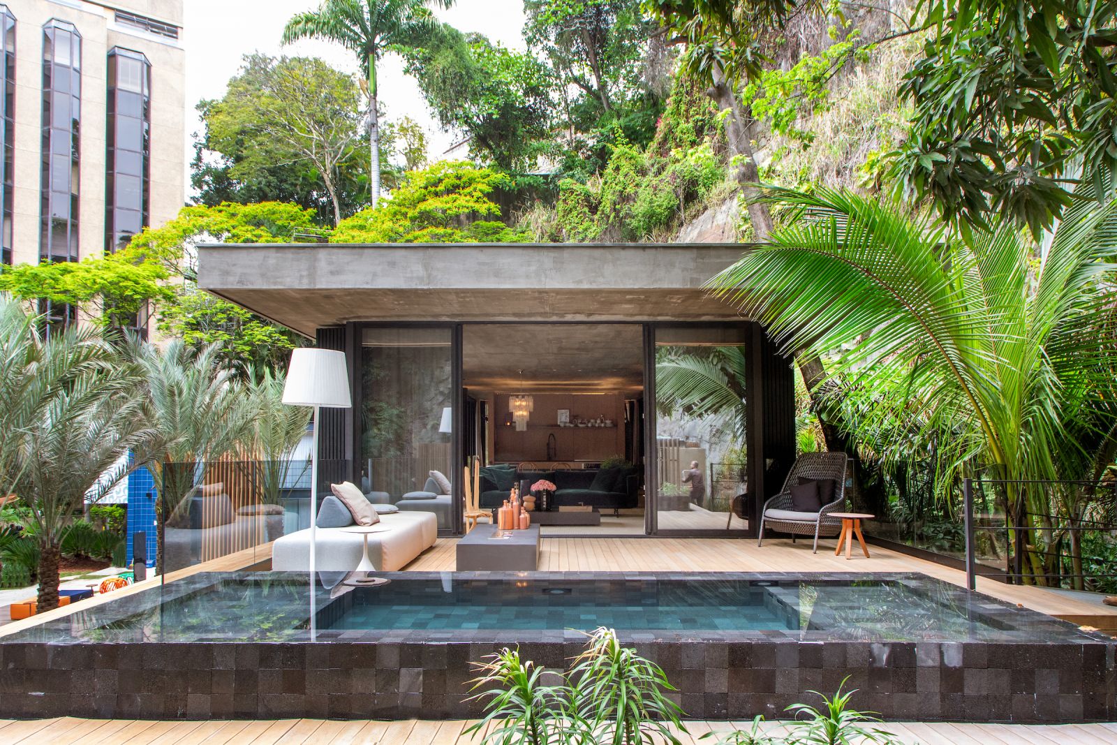 Um dos ambientes da mostra, intitulado Casa de vidro, projetado pelo Estúdio Orla, trouxe o charme cosmopolita de Nova York para a construção do espaço de mais de 100m². O café Dean & Deluca, por exemplo, conhecido point da cena gastronômica na Big Apple, traz as influências de madeira, vidro e elementos industriais. Já o Hudson Hotel, exemplo de hospedagem tipo boutique da cidade americana, inspirou o telhado, todo feito a partir de plantas. O objetivo é conectar o visitante à natureza, trazendo as tendências do decorativo conceito de florestas urbanas.