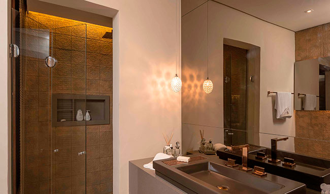 No banheiro foram usados espelhos bronze, inclusive um era iluminado. No box foi utilizado o modelo flex, pois, como o vão é bem pequeno e não havia espaço. No total, foram cerca de 9 metros quadrados de vidros incolores fornecidos pela Solid Vidros.