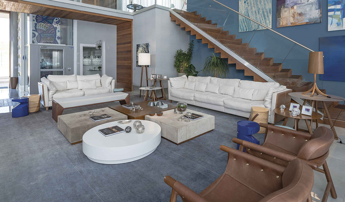 O espaço idealizado pelos arquitetos Adriano Stancati e Dani Guardini conta com uma parede azul marcante que abriga uma parte da coleção de telas assinadas pelos artistas convidados. A madeira e o porcelanato garantiram praticidade e calor para o ambiente, contra o piso cinza sofisticado. As luminárias conferem um tom intimista além do conjunto de mesas de centro que trazem a diversidade. O guarda-corpo foi instalado com vidro temperado, laminado e incolor de 16mm, da linha Easy Glass Slim, da T2G – TechInical Glass Group. Seu acabamento pode ser em aço inox ou alumínio, garantindo muita segurança e conforto.