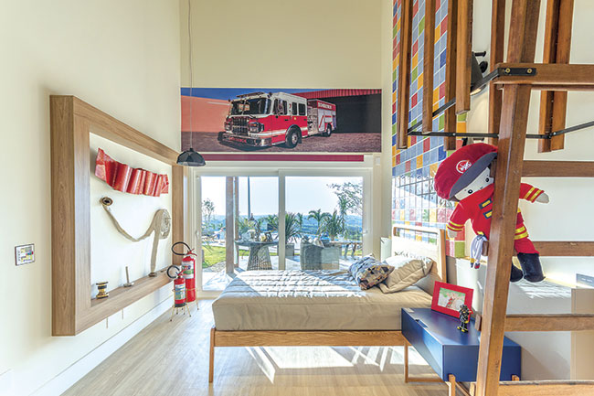 O ambiente arquitetado pela Denise Teixeira está exposto na Casa Tropicália foi feito para um filho caçula e tem o tema Corpo de Bombeiro em toda a decoração. São três ambientes. No quarto, o piso em tom neutro otimiza a claridade que entra pela porta de vidro, que é incolor e temperado, da Cebrace. A janela tem 2.20 metros de largura, espessura de 8 mm e foi utilizado 4.5 metros de comprimento. As cores fortes se destacam em pontos específicos, como no painel atrás da cabeceira, ou a foto sobre a porta corrediça. Assim como o vidro, o revestimento vinílico da ePiso garante mais higiene para o ambiente, pois este material acumula menos sujeira que a madeira, possui fácil limpeza e não escorrega.