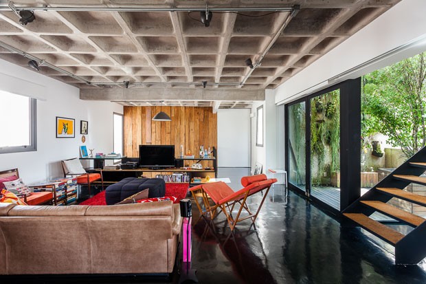 A estrutura metálica da construção na cobertura, pintada na cor preta, se espalha pelos outros andares. No intermediário, ela aparece na escada e na estante, que ocupa toda a parede, além das esquadrias. No piso, o cimento queimado ganhou um tom escuro, garantindo um ar mais descontraído ao apartamento. A maioria das paredes foi recoberta somente com pintura branca para que outros elementos marcantes como o vidro se destacassem, a exemplo do teto de cimento na sala de estar, original do projeto entregue pela construtora.