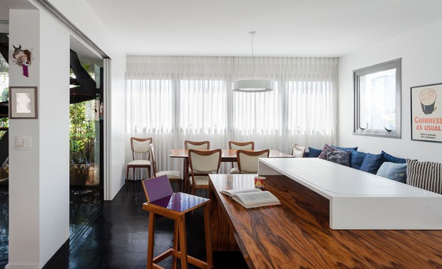 Um dos principais pedidos dos clientes foi o de que o apartamento fosse o mais aberto e iluminado possível e com um layout dinâmico para que pudessem mudá-lo facilmente, apesar de possuir ares de loft. Com espaços independentes do restante do triplex, ideal para receber os convidados com conforto.