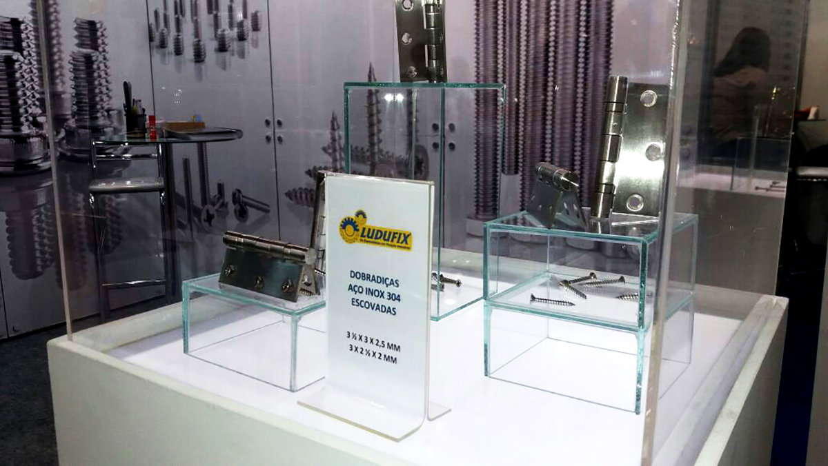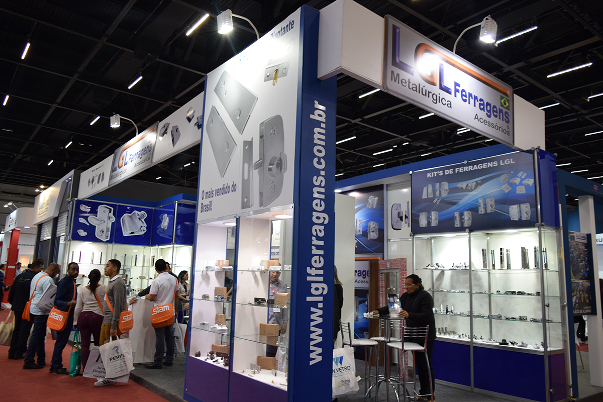 A LGL Ferragens expôs suas linhas de ferragens, acessórios, fechaduras, botões de correção, argola e calota para correntes, pivot para dobradiças inferiores, entre outros produtos.