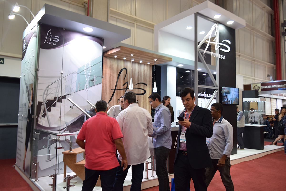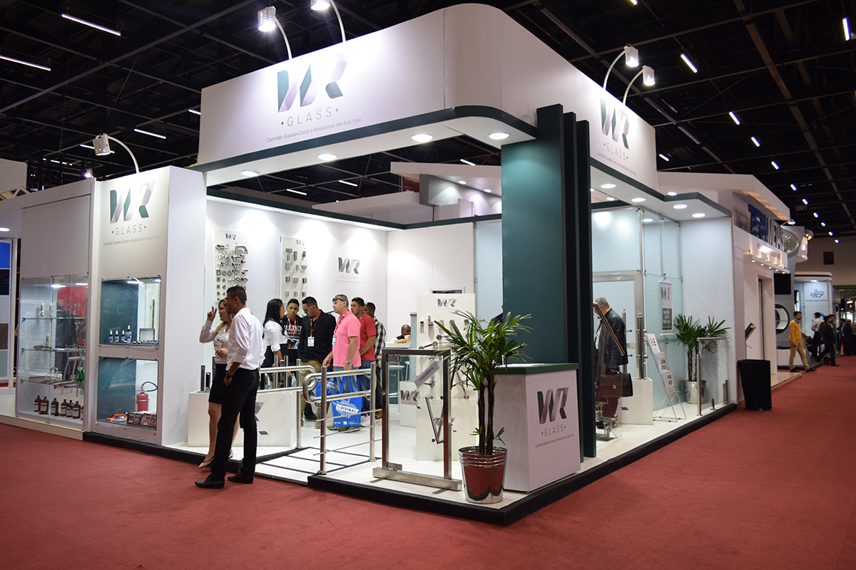 Com sua linha completa de acessórios para instalação de escadas, guarda-corpo e corrimão, a WR Glass participou da Fesqua exibindo sua linha completa de torres verticais em inox. Além disso, o estande contou com um teste de resistência em uma amostra de escada de vidro.