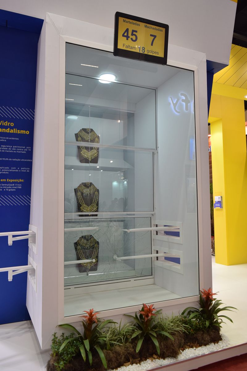 A Divinal Vidros expôs um modelo de ambiente com vidro laminado e vidro duplo, com PVB, que reduz o som exterior em 30 decibéis. A empresa comprovou a eficiência do material no isolamento acústico em um ambiente com alto volume produzido através de uma caixa de som.