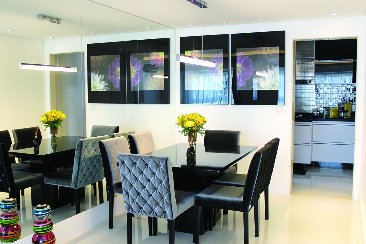 Sala de jantar possui parede espelhada e tampo da mesa de vidro. Armários da cozinha também possuem portas de vidro