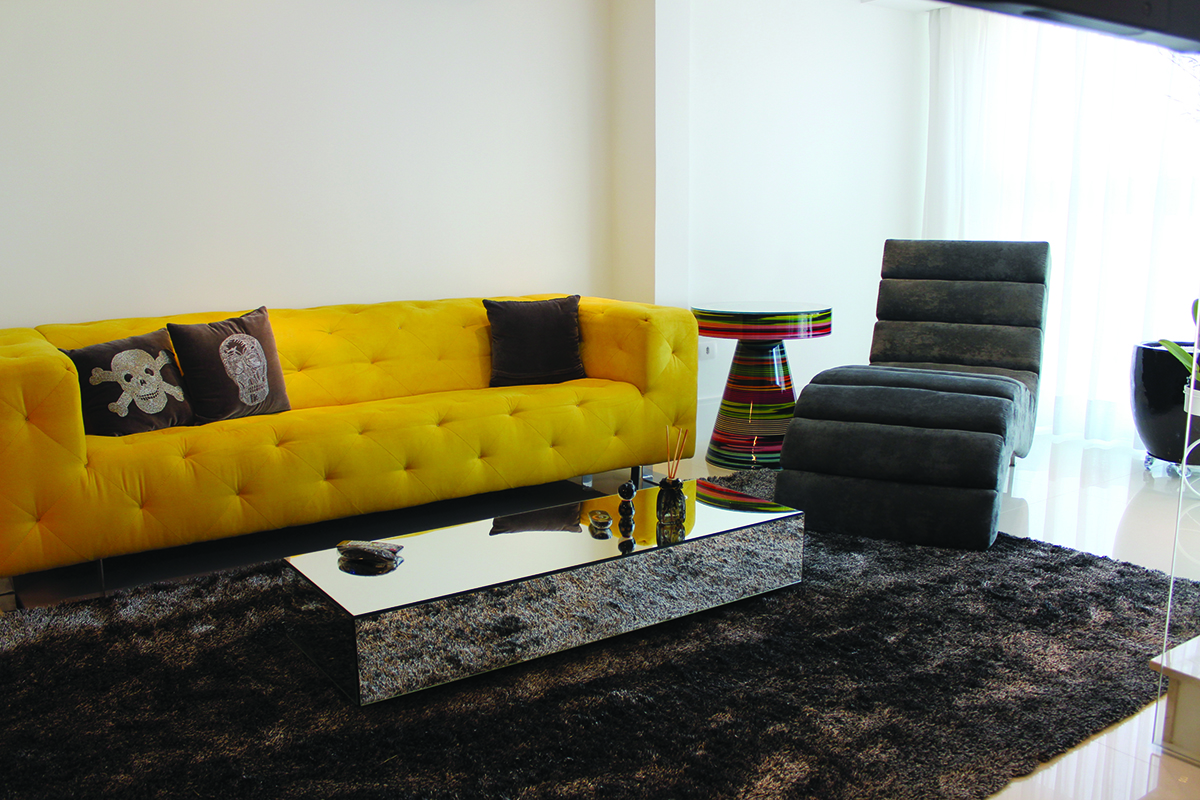 O projeto também faz bastante uso das pastilhas de vidro. Elas foram inseridas na área de churrasqueira, onde há uma mesa com tampo de vidro, e também estão presentes nos banheiros e na cozinha. Na sala de jantar, a mesa possui tampo de vidro. Até mesmo vários vasos de flores que estão espalhados pelo apartamento são feitos do material.