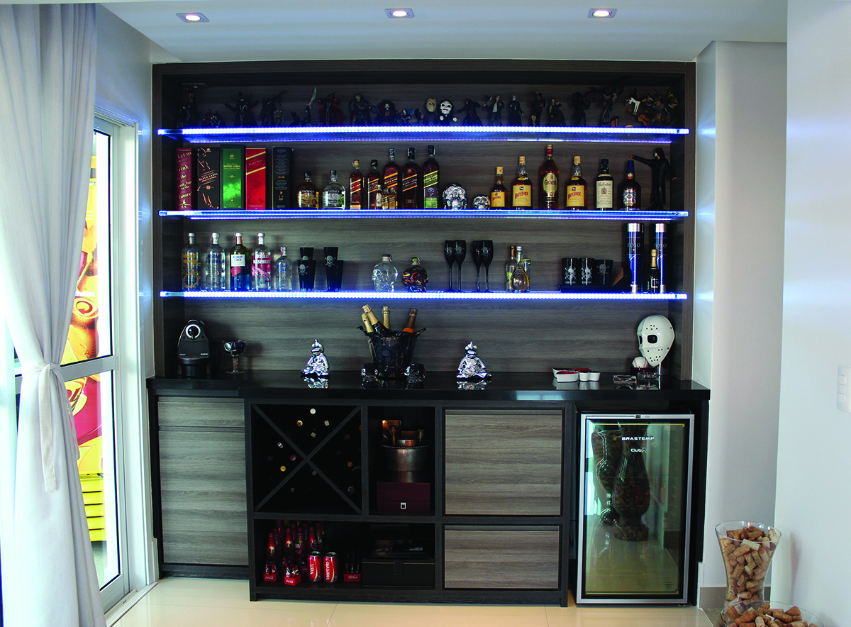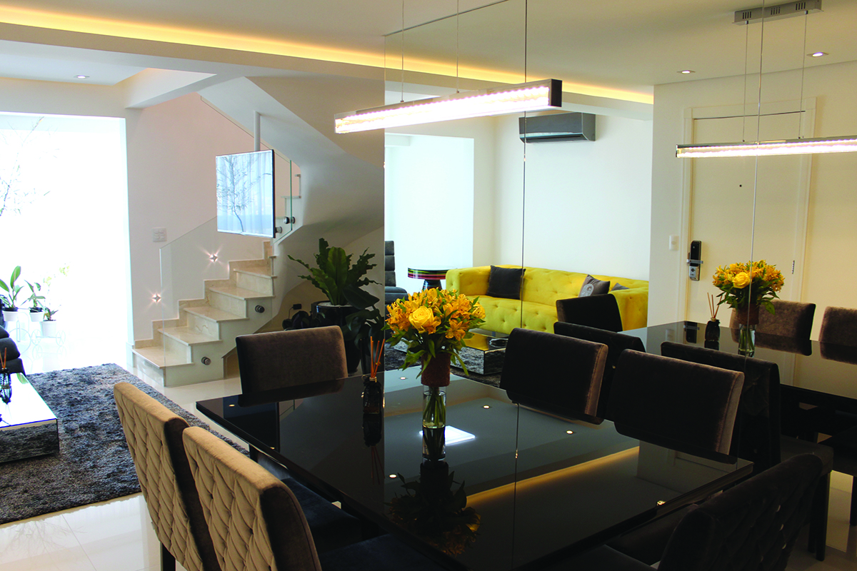 O apartamento evidencia o vidro de forma ampla e em estruturas relativamente bastante aparentes para quem visita o espaço pela primeira vez. No entanto, os detalhes do uso do vidro também trazem graciosidade e reforçam o quesito iluminação sem utilizar o material de forma agressiva. Na sala do primeiro piso, por exemplo, foi colocada uma mesinha de centro espelhada. Já no andar superior, abaixo da TV foi inserida uma espécie de prateleira feita, em partes, de vidro. Na parte da adega, a arquiteta usou vidro para fazer detalhes com fitas de led, que ficam atrás da prateleira.