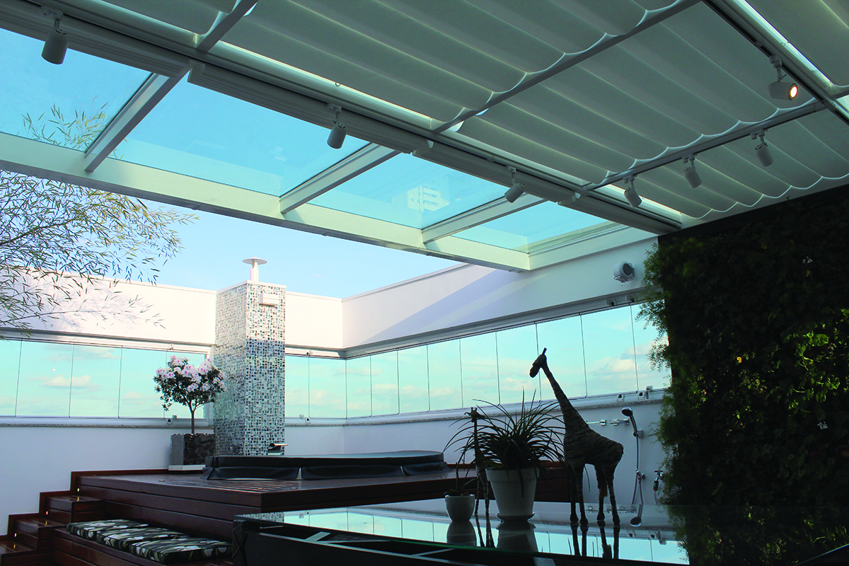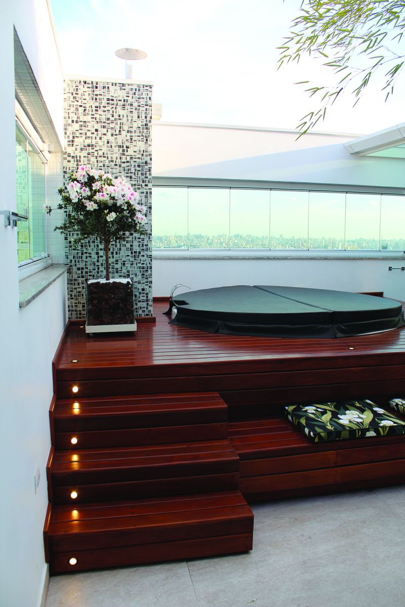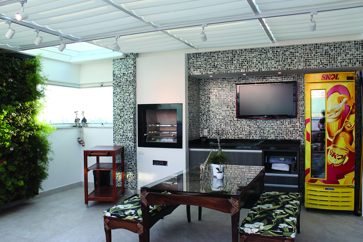 Ainda seguindo o conceito de iluminação, a cobertura da área de churrasqueira foi feita inteira com vidro temperado 12mm, com a composição de uma cortina para ser utilizada em dias de muito de sol. No mesmo espaço, há o fechamento das janelas em sistema deslizante localizado no Deck da jacuzzi. Neste, foram utilizados vidros laminados de 10mm. “A ampliação de varandas e fechamento de sacada com vidro teve, como objetivo principal, a entrada de mais luminosidade”, conta Pammela. No andar superior há a ampliação de uma varanda que também conta com portas e sacada em vidro.
