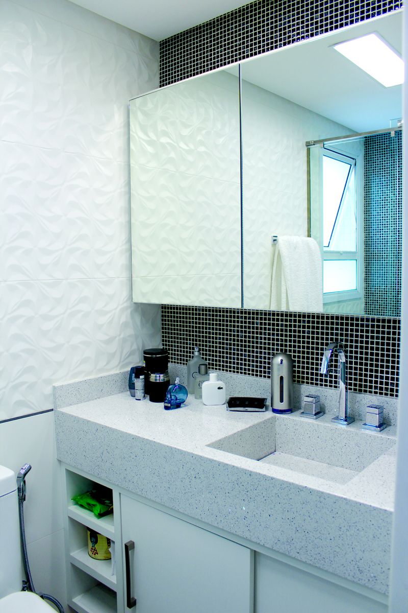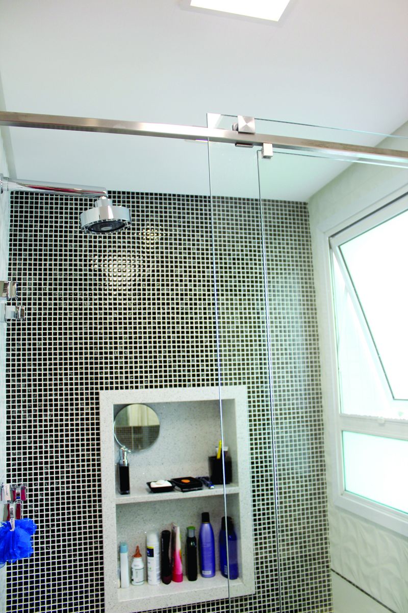 Segundo a arquiteta, foram utilizados no projeto pelo menos 85,30m² de vidro, através dos espelhos, box, prateleiras de vidro, guarda-corpo e sacada, cobertura da churrasqueira, fechamento das varandas, janelas externas e pastilhas de vidro. Os materiais foram fornecidos por três empresas: a Decoralar, que contribuiu com todos os espelhos, box, prateleiras da marcenaria e o guarda-corpo. Já o fechamento da cobertura e as sacadas foram realizados pela Vetro System. As pastilhas de vidro foram adquiridas na Tropobella. O investimento total em vidro no projeto foi de R$61 mil.