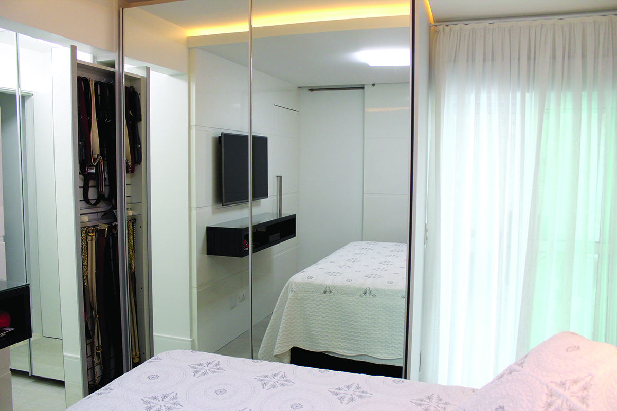 Quarto conta com armário espelhado. No banheiro, o espelho trouxe amplitude