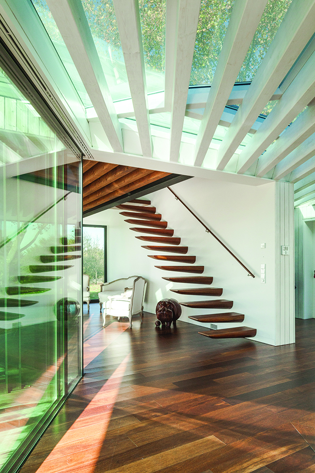 “Para materializar o objetivo principal do projeto, ou seja, o de unir as quatro casas em uma só, escolhemos o vidro como material chave, para integrar os volumes tanto para quem observa pelo exterior como para quem o percorre por dentro”, diz o arquiteto. “O vidro foi então aplicado em panos de grande dimensão, para minimizar as juntas que reduziriam o efeito desejado.”