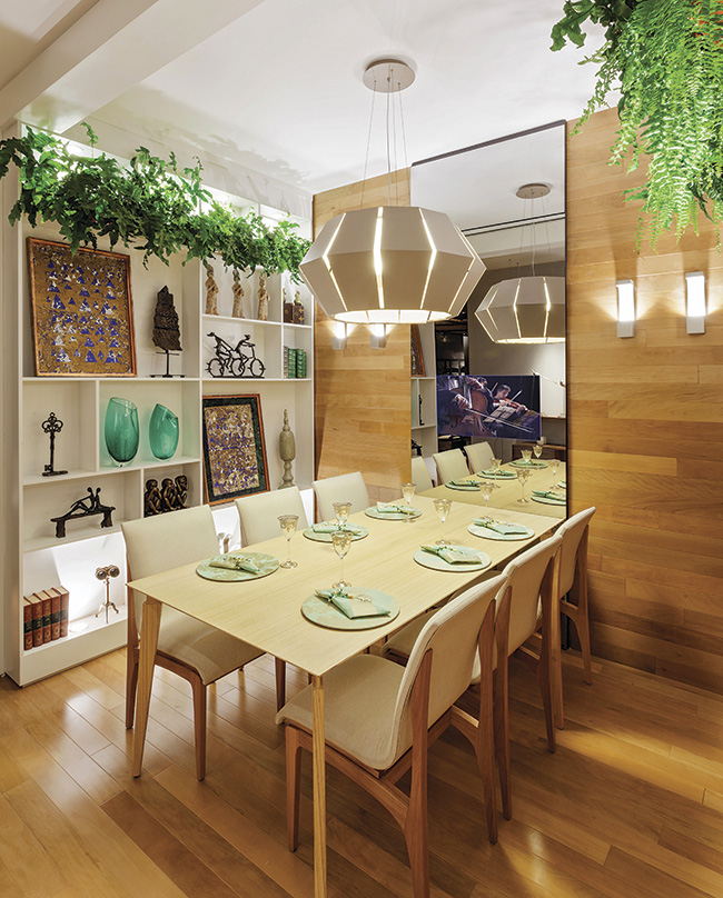 A sala de jantar projetada por Laura Santos para a Casa Cor Minas procurou criar um ambiente voltado para a convivência familiar. Inspirado na natureza, o projeto une verde e conforto e recorre à madeira como principal material de revestimento. O vidro refletivo marcava presença em um amplo painel espelhado na cor prata, instalado na parede junto à mesa de jantar, com o intuito de conferir sofisticação, leveza e amplitude ao espaço. Com espessura de 10 mm, o painel foi colado ao MDF com cola de silicone.