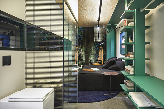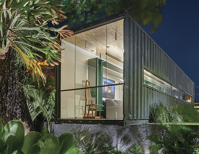 Assinado por Felipe Soares para a Casa Cor Minas, o Box 16 é definido como a “materialização de um novo estilo de vida”. O loft-contêiner de 28 m² é uma moradia compacta, completa e sustentável. Com tratamento termoacústico, o ambiente recebeu portas pivotantes de vidro laminado nas duas extremidades, direcionando a ventilzação de forma cruzada. Aberturas estratégicas nas paredes, aliadas ao box e as divisórias internas também de vidro, ajudam a manter a fluidez, a luminosidade e a leveza do espaço.