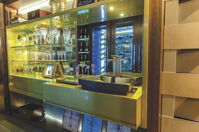 Uma adega da Lacava era o principal destaque no ambiente assinado pela Bomm Warken Arquitetura para a Casa Cor RS. Instalada em frente a uma cristaleira de vidro, a adega climatizada contava com um painel de vidro jateado ao fundo, que permitia a passagem difusa da luz, com iluminação projetada com fitas de led. O led foi o tipo de luz escolhida por não gerar calor e, assim, não interferir na qualidade do vinho. Na cristaleira, assim como nas portas da adega, a escolha das arquitetas foi pelos vidros incolores, que garantiram plena visão dos cristais e vinhos guardados no interior, como uma espécie de vitrine. No fundo da cristaleira, o revestimento de espelho cumpria a função de refletir a adega climatizada no lado oposto, conferindo amplitude ao espaço.