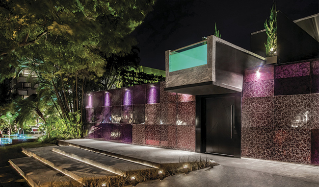 O espaço de 100 m² assinado pela arquiteta Caroline Kreling Mottin na Casa Cor RS tinha como conceito retratar um mundo moderno, contemporâneo, com municípios verticalizados e terrenos cada vez mais escassos. A projeto aproveita ao máximo cada um dos andares da casa, que em sua fachada de linha retas ostentava uma  piscina de vidro construída em balanço que, em conjunto com o revestimento de vidros pintados formando um “jardim vertical”, reafirma o estilo contemporâneo do projeto. “O uso de vidro em piscinas é tendência mundial e veio para ficar”, afirma a arquiteta.