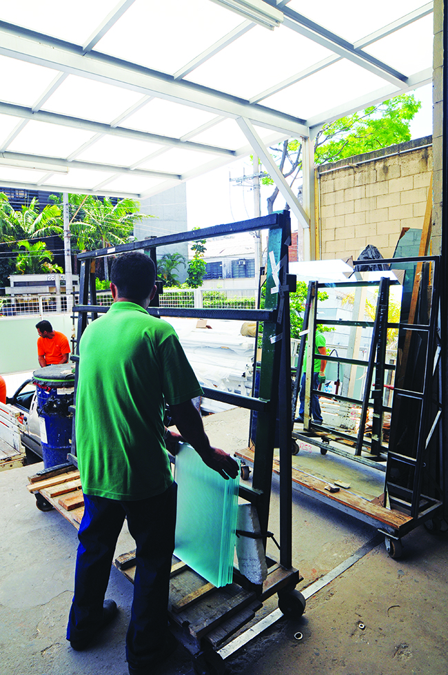 Após o beneficiamento, as peças vão para a expedição. Marcelo Martins, da Speed Temper, conta que lá o produto final é acondicionado em cavaletes e identificado por regiões e estados. Em hora programada, são enviados à doca, onde são carregados em caminhões para entrega ao cliente ou aguardam para serem retirados. Da processadora, o vidro deve sair em condições excelentes para vidraceiros ou instaladoras. A responsável por Gestão de Projetos da Pacaembu Vidros, Silvia Romano, explica que na beneficiadora os vidros são lavados e inspecionados antes mesmo do processo de têmpera e serigrafia, para evitar que sejam entregues ao cliente com riscos.