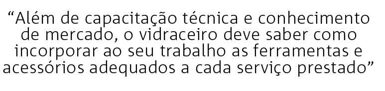 Somado ao aumento da demanda por instalações mais sofisticadas, o avanço tecnológico dos vidros e sistemas de aplicação traz à tona a necessidade de preparo e qualificação técnica de um dos mais importantes elos dessa cadeia: as vidraçarias. “Além de capacitação técnica e conhecimento de mercado, o vidraceiro deve saber como incorporar ao seu trabalho as ferramentas e acessórios adequados a cada serviço prestado”, comenta o instrutor Ricardo Camara, da Central do Vidraceiro. “Atuar na instalação de vidros requer, além de conhecer novas tecnologias, saber exatamente quais os equipamentos imprescindíveis para garantir segurança, agilidade e qualidade no trabalho”.