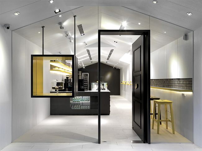 Ao projetar uma loja de cupcakes, a proposta dos arquitetos da JC Architecture para este estabelecimento em Taiwan foi celebrar a simplicidade e a elegância desses irresistíveis bolinhos. O design criativo é expresso logo na fachada que, inspirada nas embalagens dos cupcakes, chama a atenção pela forma inusitada com que os arquitetos abrem dois recortes retangulares no vidro, um para a porta, outro para uma pequena janela, brincando com o efeito de transparência do material, instalado do piso ao teto. Internamente, o vidro também aparece no balcão onde os doces estão expostos, além de compor uma proteção transparente que permite visualizar o trabalho de produção das guloseimas.