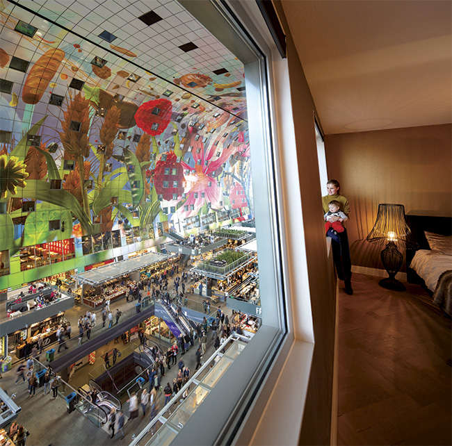 O projeto dos holandeses do MVRDV é mais do que um supermercado, mais do que um shopping, mais do que uma praça de alimentação e mais do que um edifício residencial. É tudo isso junto. Inspirado em propostas similares implantadas em Estocolmo, Barcelona e Valência, o Markthal, inaugurado em outubro do ano passado, é o primeiro mercado de alimentos coberto da Holanda. Suas altas paredes coloridas sustentam a cobertura sobre a qual estão instalados 200 apartamentos fechados com vidros triplos, à prova de odores e de ruídos. Com belas imagens impressas, as superfícies laterais atingem 40 m de altura e constituem um espetáculo à parte, associadas à gigantesca fachada que oferece ampla visibilidade a quem passa em frente ao complexo. Do lado de dentro, mais de 90 barracas e estandes, alguns com cobertura de vidro, vendem de peixe fresco a frutas, vinhos, queijos, sorvetes artesanais e comidas típicas de vários países. No nível subterrâneo há um supermercado para quem queira complementar as compras. Fixados por cabos de aço, os panos de vidro formam uma superfície única e contínua a refletir o céu de Roterdã.