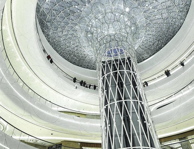 Os arquitetos do escritório holandês UNStudio são os responsáveis pelo projeto deste luxuoso shopping center chinês, concluído em meados de 2013. A edificação abriga marcas internacionais, cinemas e praça de alimentação. Pautada por conceitos de luxo e sinergia de materiais nobres, porém simples, o projeto recorre ao vidro em inúmeras aplicações internas e externas. Dois blocos constituem a essência do projeto, cada um deles ostentando uma estrutura afunilada de vidro que se estende do térreo à cobertura, desembocando em uma claraboia. Estabelecendo uma comunicação entre padrões geométricos, cores e materiais, cada unidade abriga um par de elevadores panorâmicos e é revestida por 2,6 mil painéis de vidros planos e curvos, instalados em estruturas de aço e com um intrincado padrão geométrico impresso digitalmente na superfície. Do lado de fora, uma fachada projetada pela Arup exibe a combinação de aço inoxidável e vidros impressos, que juntos formam 42 mil esferas com luzes de LED integradas, produzindo diferentes padrões visuais. Na parte inferior, a fachada é composta por vidros planos laminados, fornecidos pela SCG e GlassTongue.