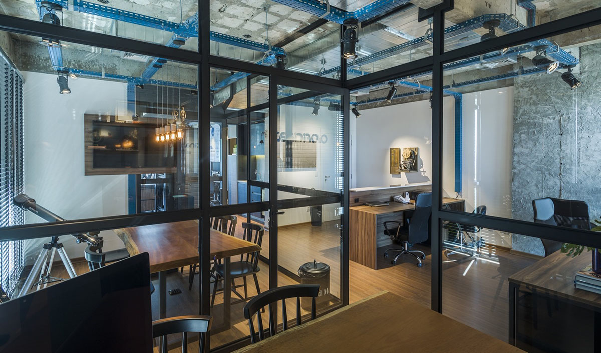 Um escritório de maquetes eletrônicas e 3D, onde seu maior propósito era um design que estimulasse a criatividade e interação entre a equipe, de forma democrática e confortável. Assim surgiu este projeto em que o vidro faz sua função de integração e amplitude e suas divisórias quadriculadas possuem um sistema de encaixe para vidros, trazendo maior isolamento acústico e acabamento impecável.