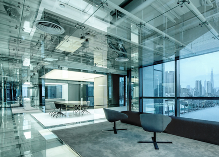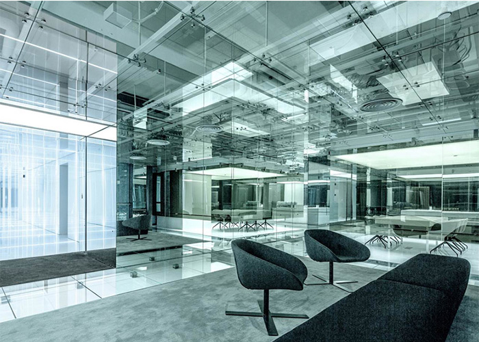 A combinação de vidros e espelhos utilizada proporciona um jogo de reflexos que deixa visíveis não só as maquetes e os móveis no interior das salas de reuniões, mas também a altura e estrutura originais do prédio. Além disso, os reflexos emitidos mostram uma espécie de “realidade dupla”, que se funde com a impressionante vista do Centro de Xangai.