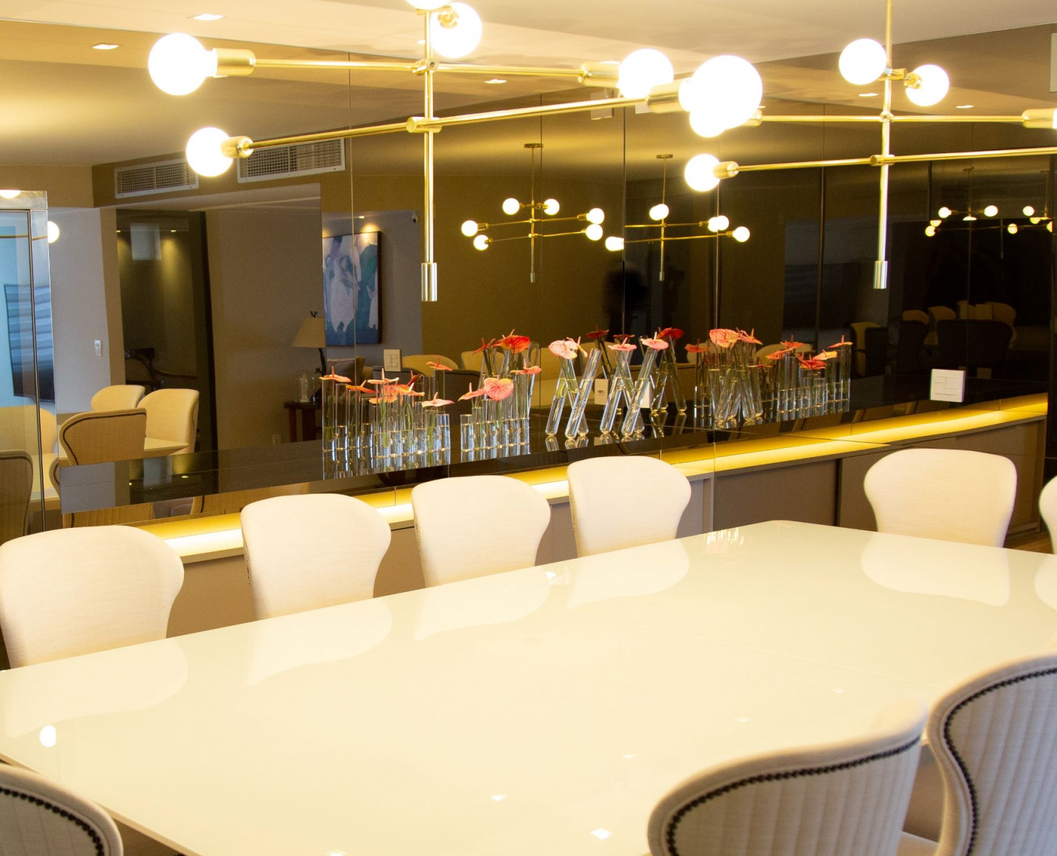 A arquiteta Juliana Farias escolheu o espelho VIVIX Spelia Bronze para o projeto de uma sala de jantar residencial, conferindo sofisticação, além de mais amplitude ao ambiente.