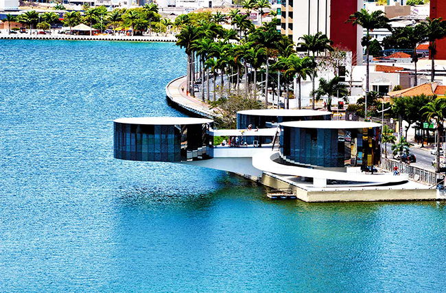 A solução encontrada por Niemeyer foi elevar o piso dos pavilhões de exposição, recurso que deu mais visibilidade às edificações e liberou a visão do espelho d’água a partir da via que circunda o açude.